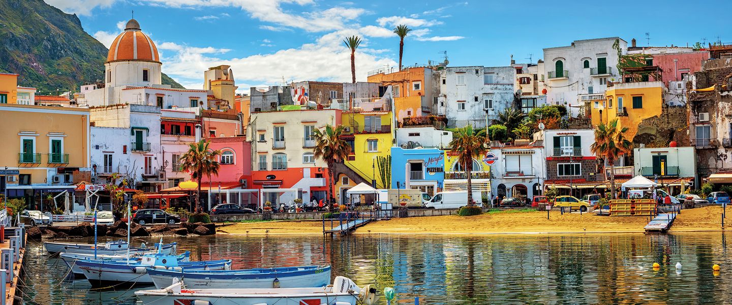 Ischia liegt im Tyrrhenischen Meer, etwa 30 Kilometer von Neapel entfernt und ist die größte der Phlegräischen Inseln. Geografisch ist die Insel von steilen Küsten, sanften Hügeln und üppiger Vegetation geprägt, die eine beeindruckende Kulisse für die malerischen Strände und Dörfer bieten. Die Anreise nach Ischia erfolgt in der Regel mit der Fähre oder dem Tragflächenboot von Neapel oder Pozzuoli, wobei die Überfahrt etwa 1 bis 1,5 Stunden dauert. Die zentrale Lage von Ischia macht sie zu einem idealen Ziel für Tagesausflüge von Neapel oder als Teil einer Erkundungstour durch die Region Kampanien, die auch die Amalfiküste und die Insel Procida umfasst. Die Kombination aus natürlicher Schönheit, kulturellem Erbe und der Möglichkeit, die italienische Lebensart zu genießen, macht Ischia zu einem unverzichtbaren Ziel für Reisende, die die Vielfalt und den Charme dieser einzigartigen Insel entdecken möchten.