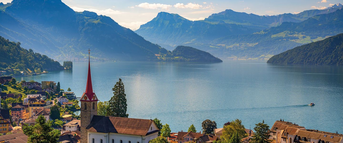Weggis ist eine malerische Gemeinde am Vierwaldstättersee in der Zentralschweiz, die im Kanton Luzern liegt. Die Stadt ist bekannt für ihre atemberaubende Landschaft, die von den umliegenden Bergen und dem glitzernden Wasser des Sees geprägt ist. Weggis ist berühmt für seine milden klimatischen Bedingungen, die es zu einem beliebten Ziel für Touristen machen, die Erholung und Natur suchen. Historisch gesehen war Weggis ein wichtiger Handelsplatz und ein beliebter Kurort im 19. Jahrhundert, was zur Entwicklung der Infrastruktur und des Tourismus in der Region beitrug.